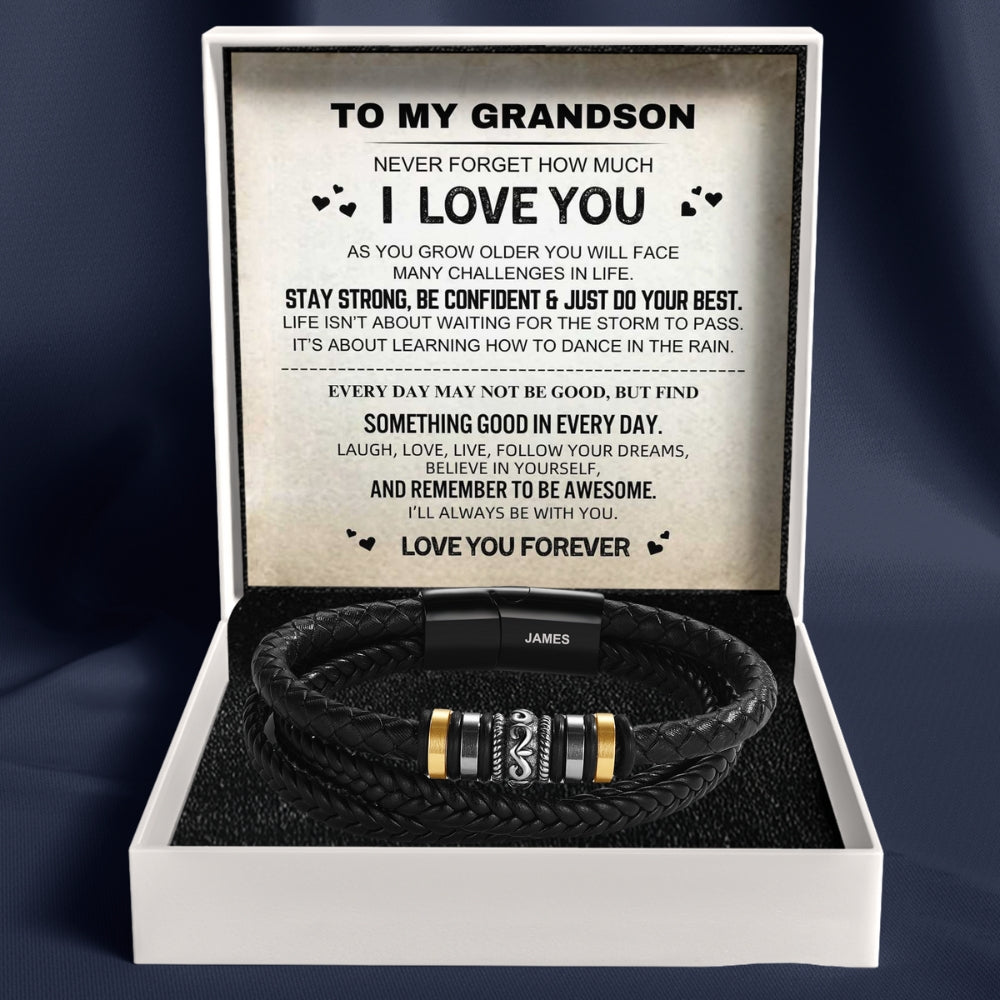 Gift your grandson this leather Bracelet with Name Engraving — a meaningful symbol of your love, belief, and unwavering support. A daily reminder for him to face life’s challenges with courage, stay true to himself, and always remember how deeply he’s loved.