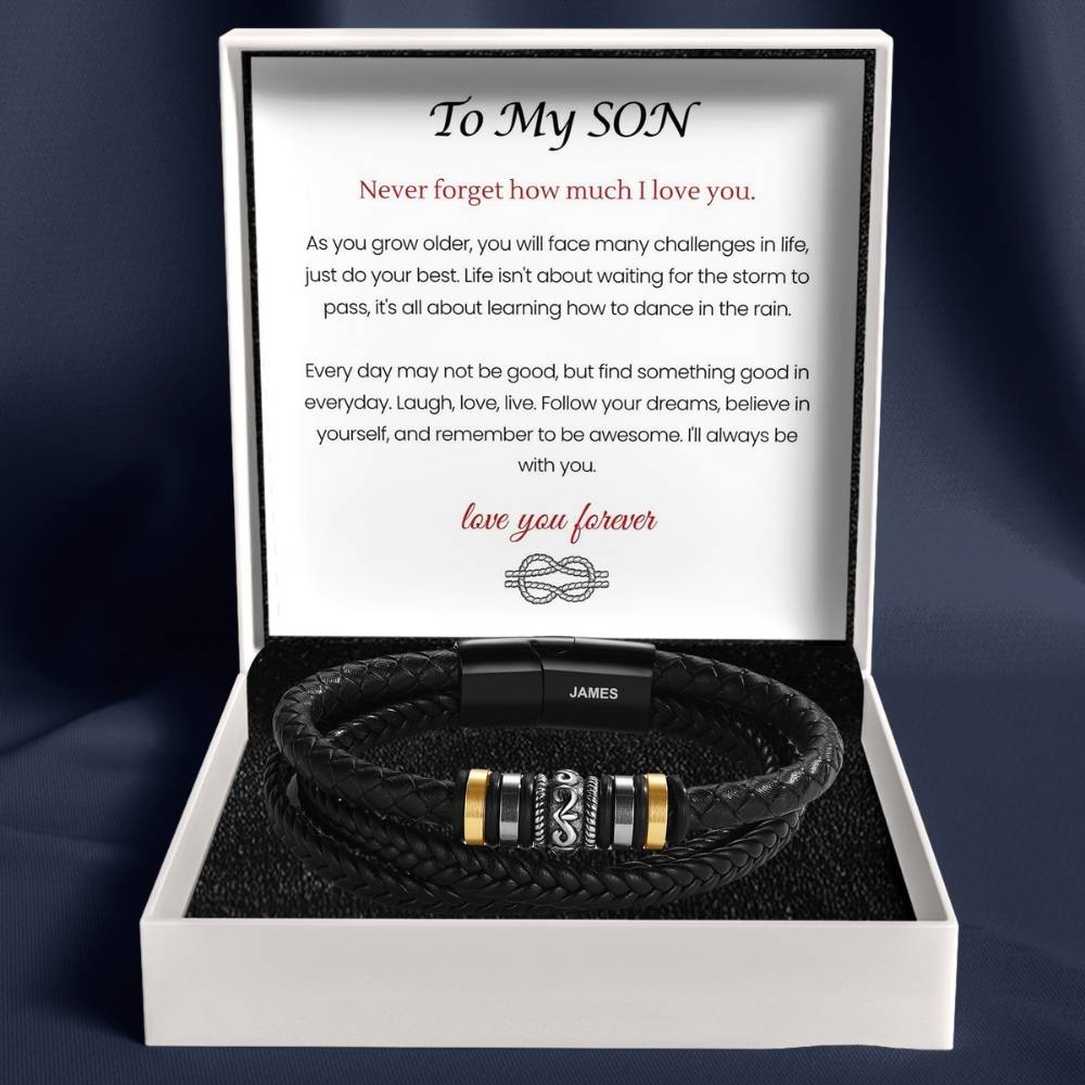 Gift your son the Braided Leather Bracelet with Name Engraving — a meaningful symbol of your love, belief, and unwavering support. A daily reminder for him to face life’s challenges with courage, stay true to himself, and always remember how deeply he’s loved.