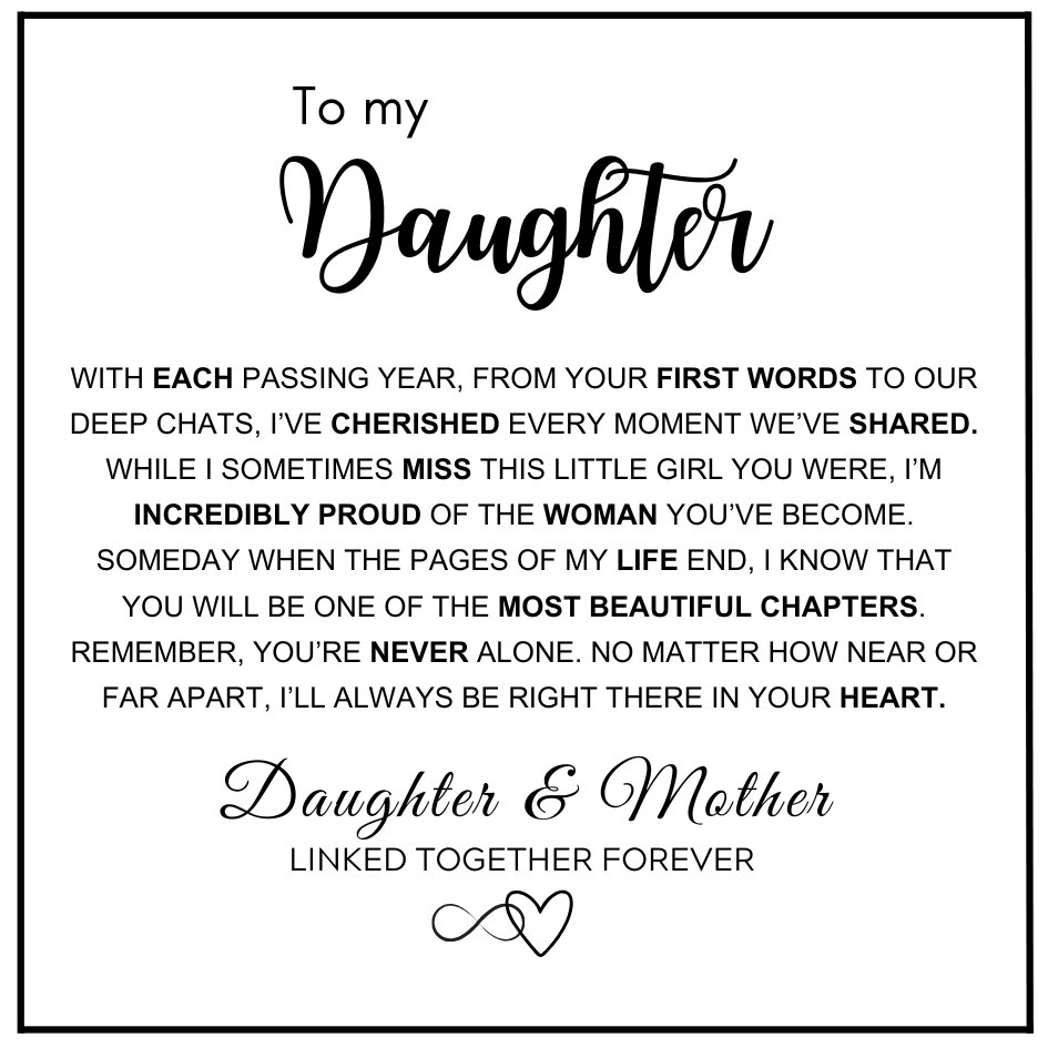 Wrapped her wrist with this charming and meaningful To My Daughter – Infinity Heart Bracelet – Forever Linked Together. Give your daughter a symbol of everlasting love and devotion, a timeless piece that speaks volumes without saying a word.